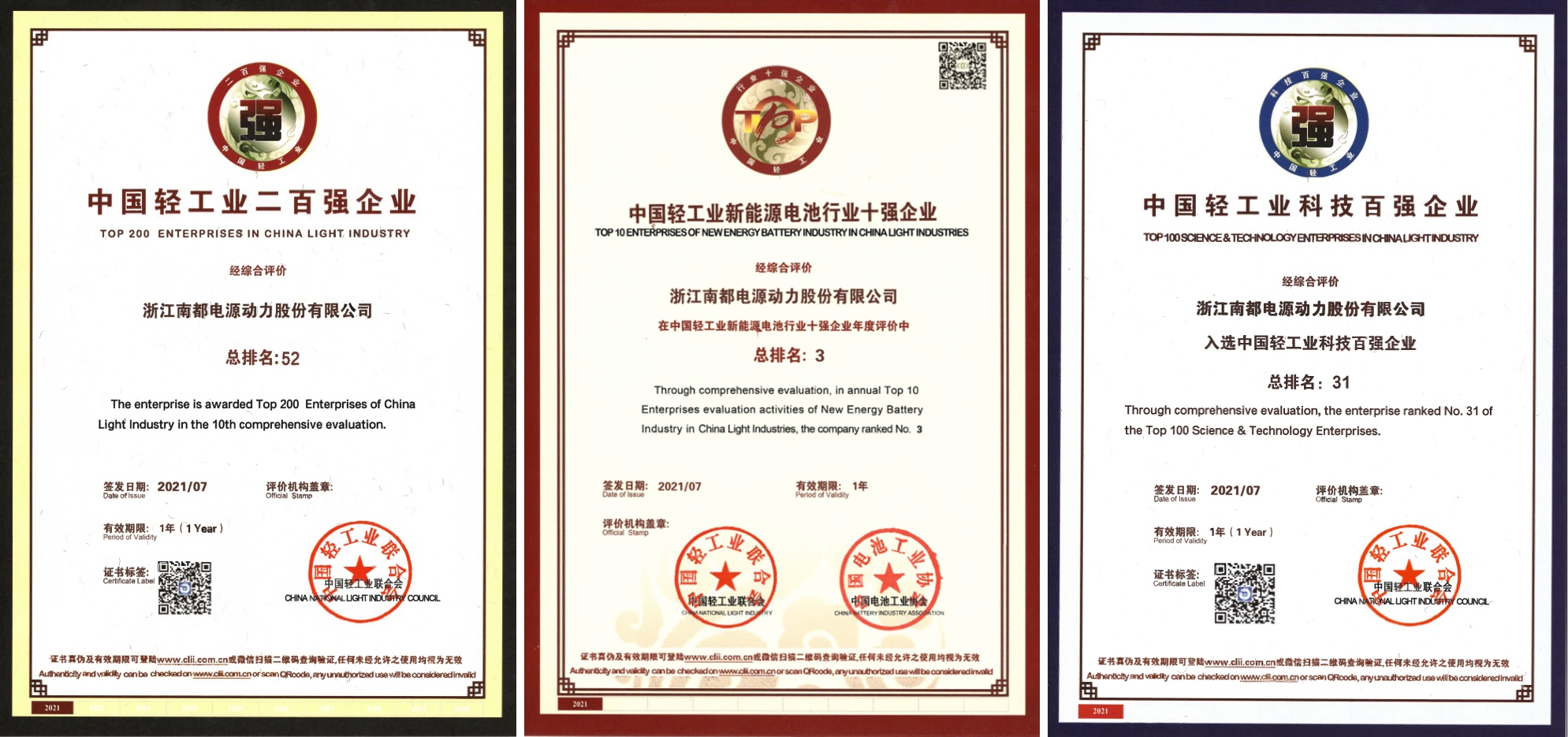 日前,中国轻工业联合会发布了 2020 年度中国轻工业二百强企业榜单,欧美性爱 再次入选,位列第 52 位,同时公司还荣获了中国轻工业科技百强榜第 31 位和中国轻工业新能源电池行业十强榜第 3 位。这也是“中国轻工业百强企业”自 2011 年发布以来,欧美性爱 连续十年上榜。