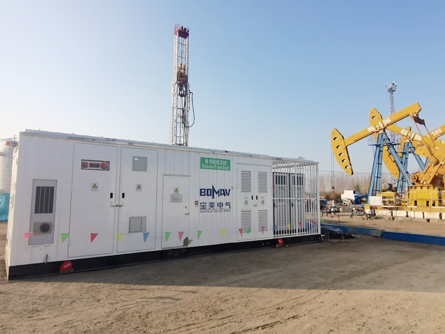 在另一个辽河油田项目中,宝美电气与欧美性爱 联合建设的储能系统,可自动识别钻修井作业工况,动态匹配发电机启停策略,实现恒压电流输出,减少了能源浪费。储能系统的建设,可为单口钻井作业节约20万元左右费用。