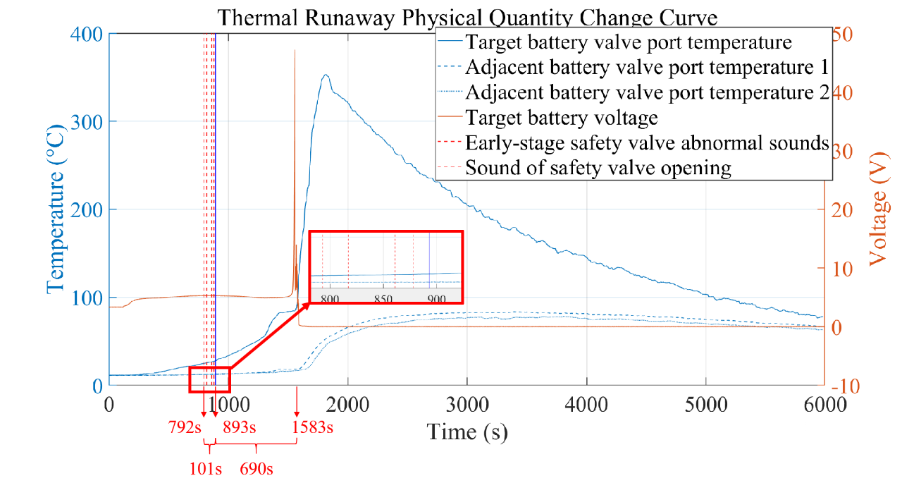 这些声波信号由安全阀受压产生,记录了热化学反应初期的压力扰动信息。研发团队据此提出热失控早期声学前兆检测机制,实现了对热失控的超前识别。